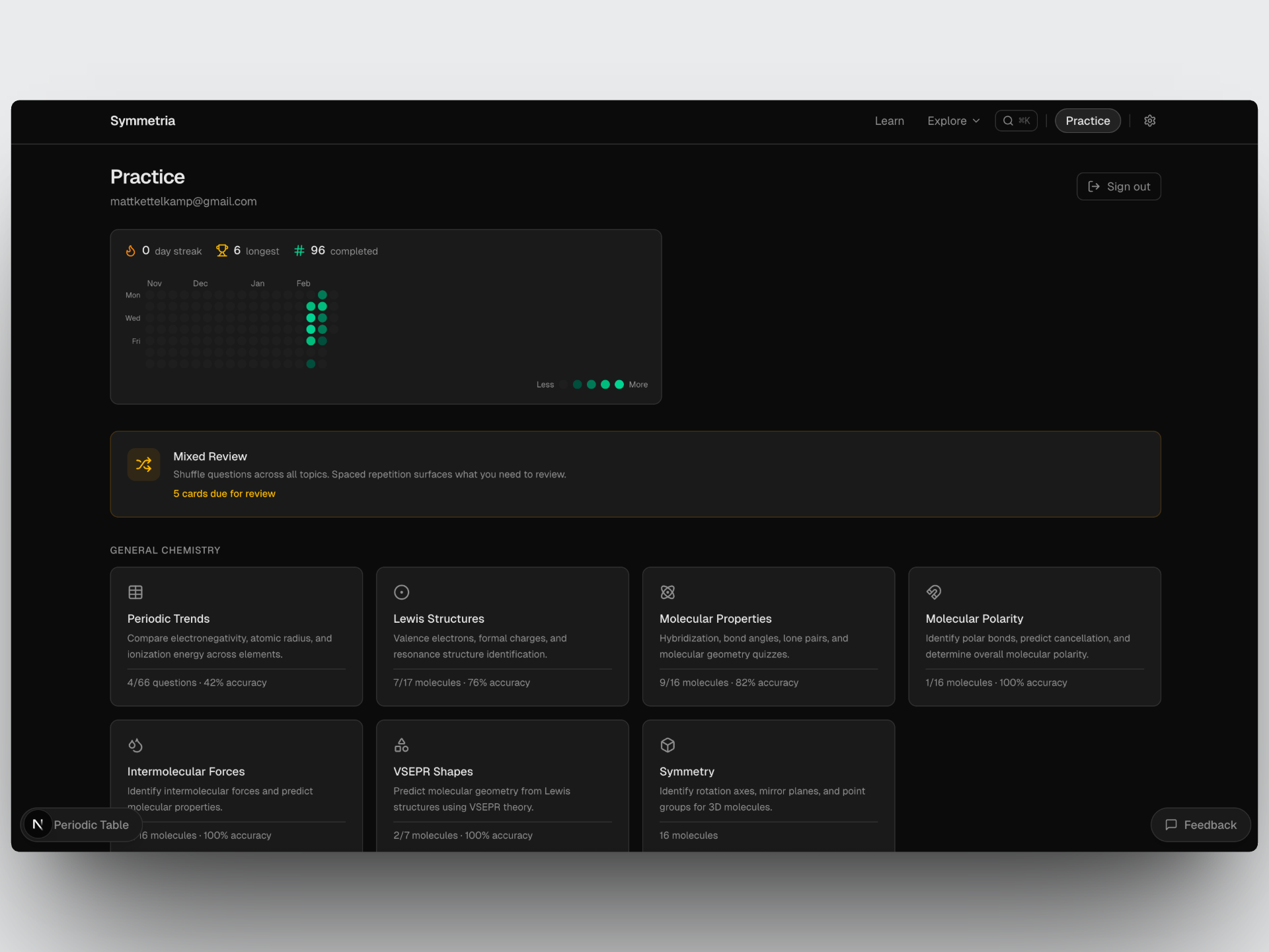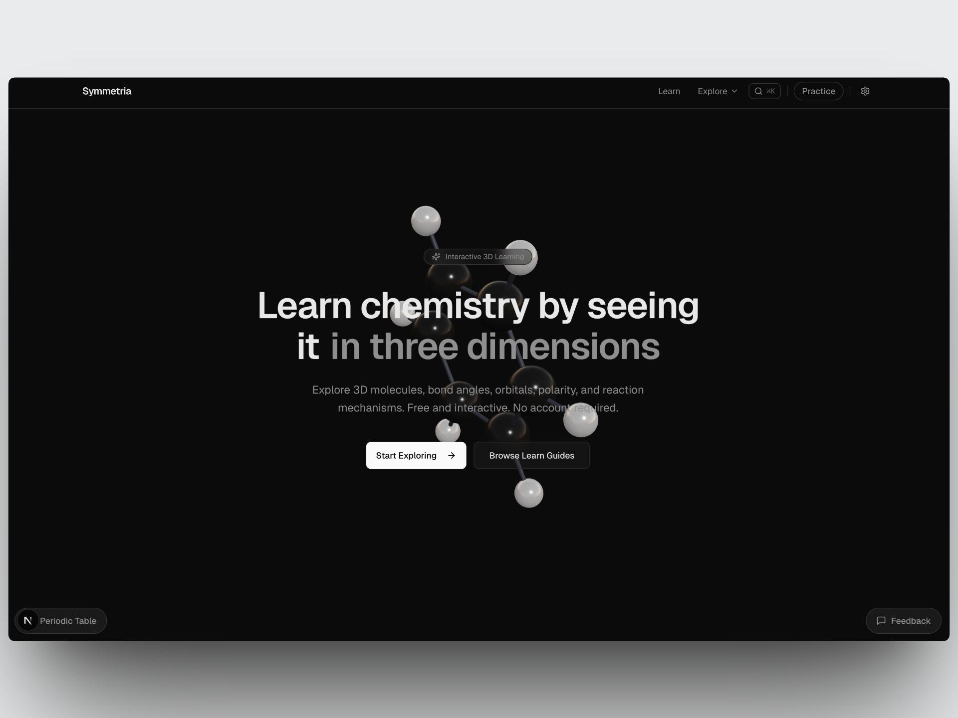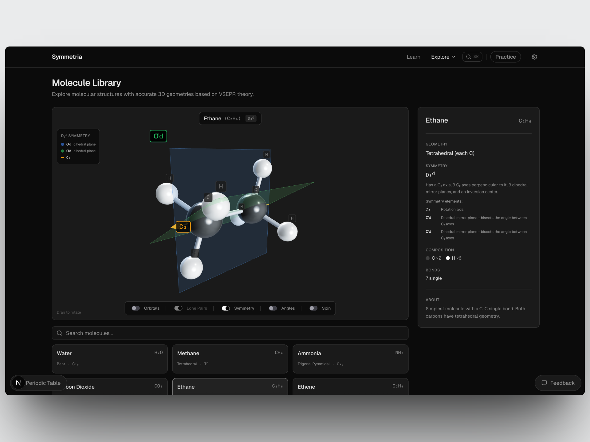 Back in college, I loved organic chemistry because of how spatial and visual it was. However, that also meant it was always difficult to learn many of the concepts. I had thought back then that it would be great to have a way to visualize and interact with the concepts in a more engaging way. Sitting in the back of an inorganic chemistry class attempting to learn symmetry elements was very frustrating and thus the idea for Symmetria was born.